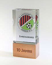 Holzawards können mit Lasergravur und/oder abriebfestem UV-Digitaldruck veredelt werden. Eine Trophäe aus Holz in Verbindung mit reinem Glas kann mit unterschiedlichen Druck- oder Gravurtechniken veredelt werden.