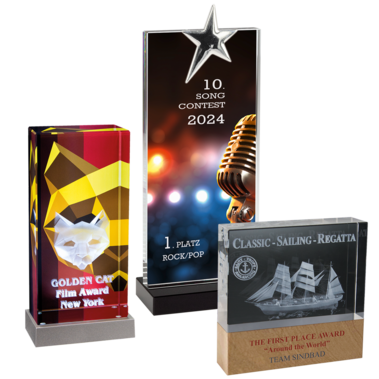 Bei unseren Awards kommen unterschiedliche Materialien wie Glas, Holz, Edelstahl oder Kombinationen daraus zum Einsatz. Die Awards und Glastrophies werden in unserem Haus designt und mit den verschiedensten Techniken veredelt, z.B. Laserinnengravur in 2D/3D, Digitaldruck, Siebdruck oder Sandstrahlen.