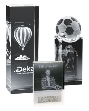 Eine elegante Art für einen Award oder Auszeichnung ist ein Glaspokal mit 2D- oder 3D-Laserinnengravur in Kristallglas. Wir haben eine große Auswahl an Glasformen immer auf Lager und können Ihnen innerhalb weniger Tage Ihren Pokal fertigen. Eine Glastrophy aus unserem Standard-Katalog ist sehr individuell gestaltbar und dennoch preisgünstig.