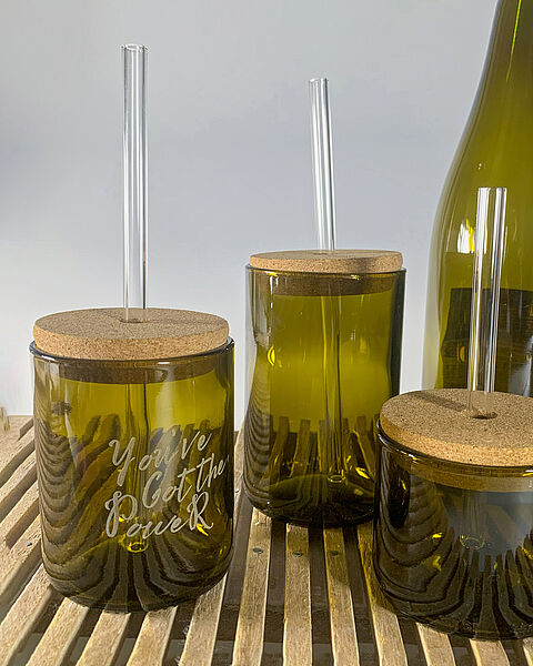 Wir verfügen über ein großes Sortiment an nachhaltigen und personalisierbaren Werbegeschenken und Promotionartikeln, z.B. wiederverwendbare Glastrinkhalme oder Upcycling-Trinkgläser und -Karaffen aus Weinflaschen.