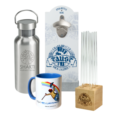 Unser Standardsortiment bietet verschiedenen Produkte aus den Bereichen Lifestyle, Deko oder Büro, die wir für Sie individualisieren, z.B. mit einer Lasergravur, farbigem Digitaldruck, Laserinnengravur, Sublimationsdruck. Ein großes Augenmerk liegt auf nachhaltige Werbeartikel, wie z.B. den Upcycle-Gläsern, -Karaffen oder -Windlichtern, den Barbaydos Glastrinkhalmen, den Schneidebrettern aus europäischem Holz u.v.m.