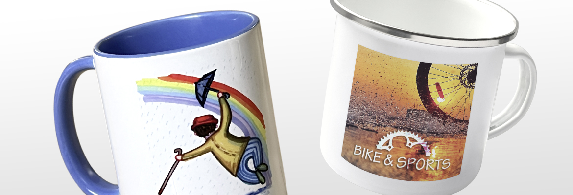 Auch der Sublimationsdruck kommt bei unseren Werbegeschenken ebenfalls zum Einsatz - beispielsweise bei farbigen Tassen aus Keramik, Emaille-Henkeltassen etc.